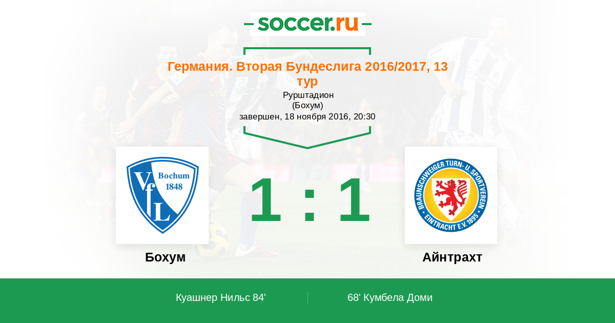 Германия. Бундеслига 2 21.10.2017 Айнтрахт Логотип футбольный клуб Айнтрахт (Брауншвейг) 1:0 Логотип футбольный клуб Бохум Бохум