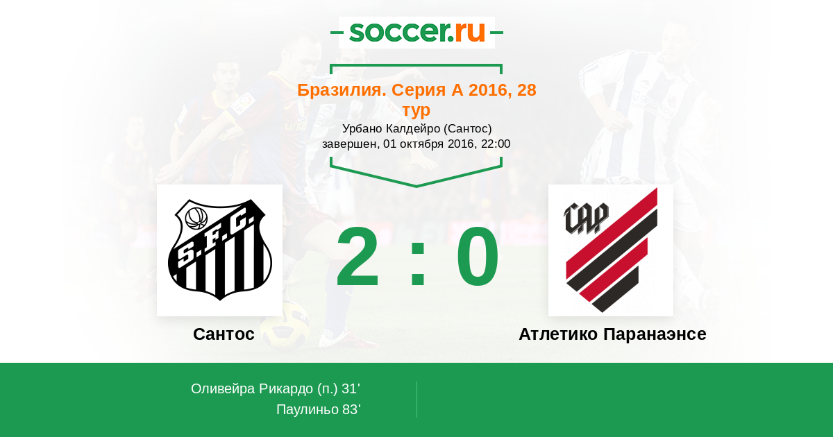 Бразилия. Серия А 19.06.2016 Атлетико Паранаэнсе Логотип футбольный клуб Атлетико Паранаэнсе (Куритиба) 1:0 Логотип футбольный клуб Сантос (Сан-Паулу) Сантос