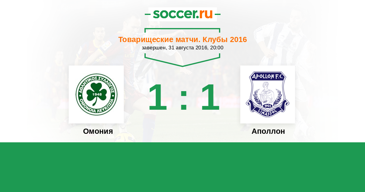 Кипр. Первый Дивизион 02.10.2016 Аполлон Логотип футбольный клуб Аполлон (Лимассол) 2:1 Логотип футбольный клуб Омония (Никосия) Омония