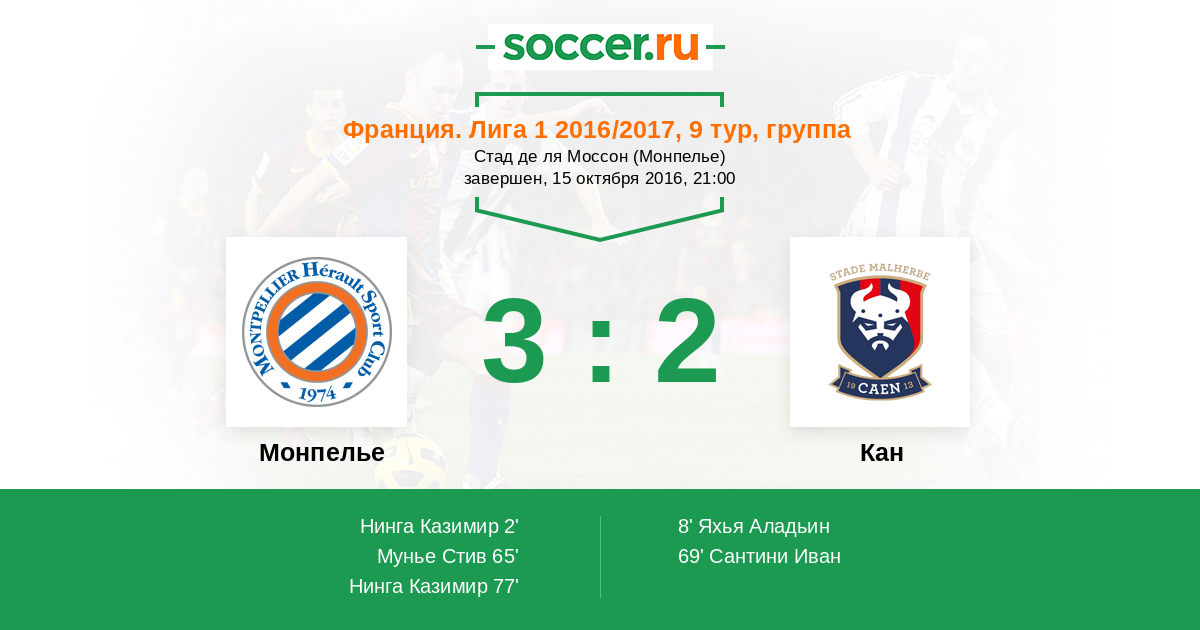 Франция. Лига 1 23.01.2016 Монпелье Логотип футбольный клуб Монпелье 1:2 Логотип футбольный клуб Кан Кан