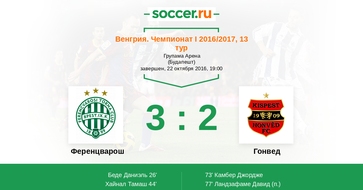 Венгрия. Чемпионат 1 16.04.2013 Гонвед Логотип футбольный клуб Гонвед (Будапешт) 1:0 Логотип футбольный клуб Ференцварош (Будапешт) Ференцварош