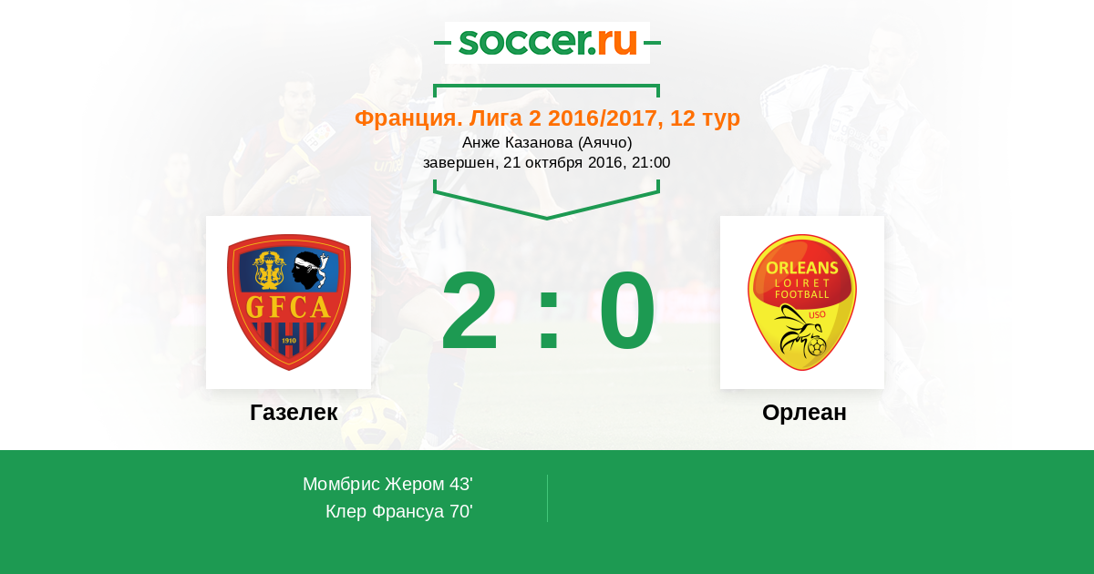 Франция. Лига 2 27.02.2015 Газелек Логотип футбольный клуб Газелек (Аяччо) 3:2 Логотип футбольный клуб Орлеан Орлеан