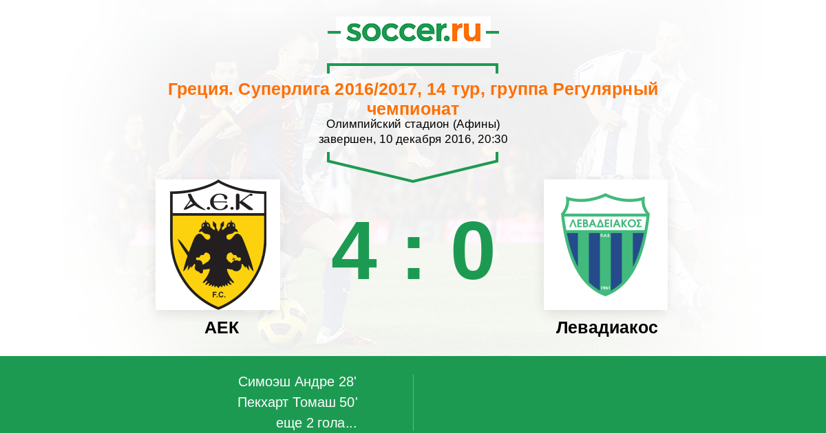 Греция. Суперлига 03.12.2017 Левадиакос Логотип футбольный клуб Левадиакос (Левадия) 0:2 Логотип футбольный клуб АЕК (Афины) АЕК