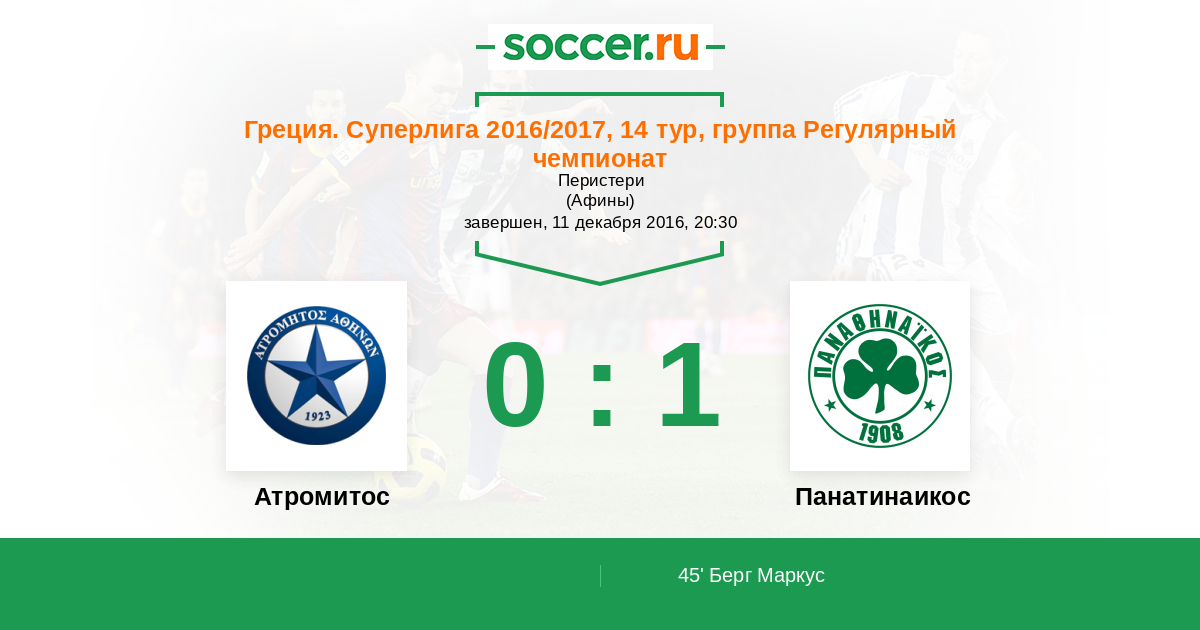 Греция. Суперлига 06.03.2016 Панатинаикос Логотип футбольный клуб Панатинаикос (Афины) 2:0 Логотип футбольный клуб Атромитос (Перистери) Атромитос