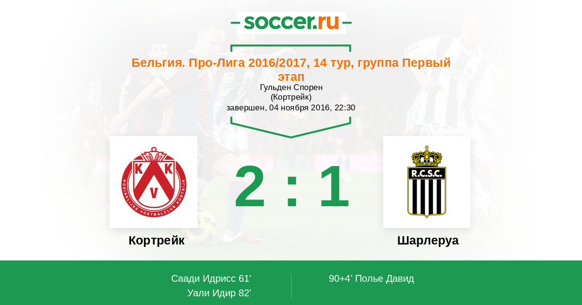 Бельгия. Про-Лига 01.12.2012 Шарлеруа Логотип футбольный клуб Шарлеруа 2:0 Логотип футбольный клуб Кортрейк Кортрейк