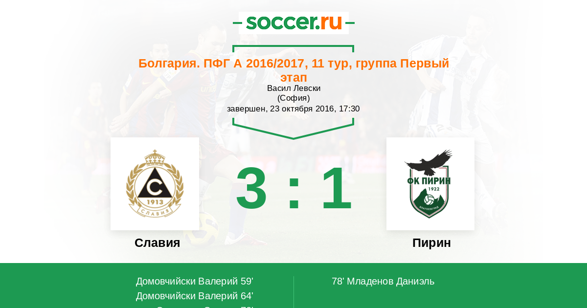 Болгария. Первая лига 12.03.2017 Пирин Логотип футбольный клуб Пирин (Благоевград) 4:0 Логотип футбольный клуб Славия (София) Славия