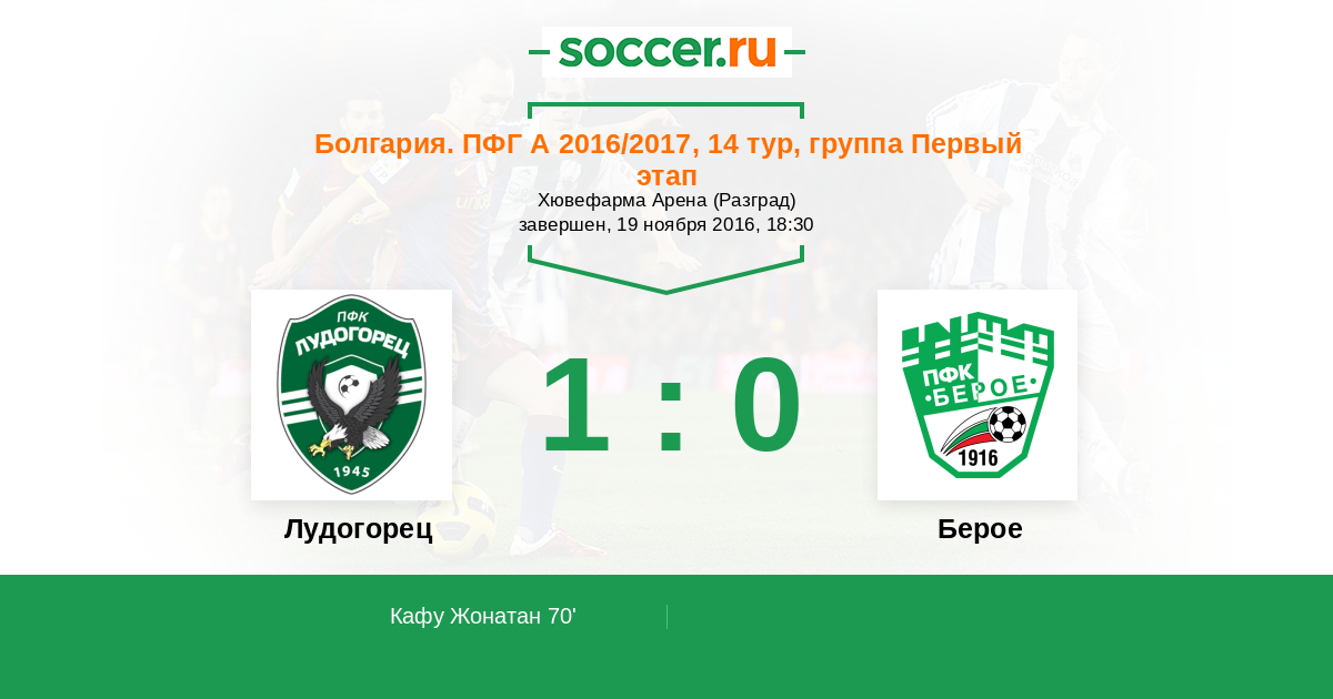 Болгария. Первая лига 16.11.2016 Берое Логотип футбольный клуб Берое (Стара-Загора) 0:2 Логотип футбольный клуб Лудогорец (Разград) Лудогорец