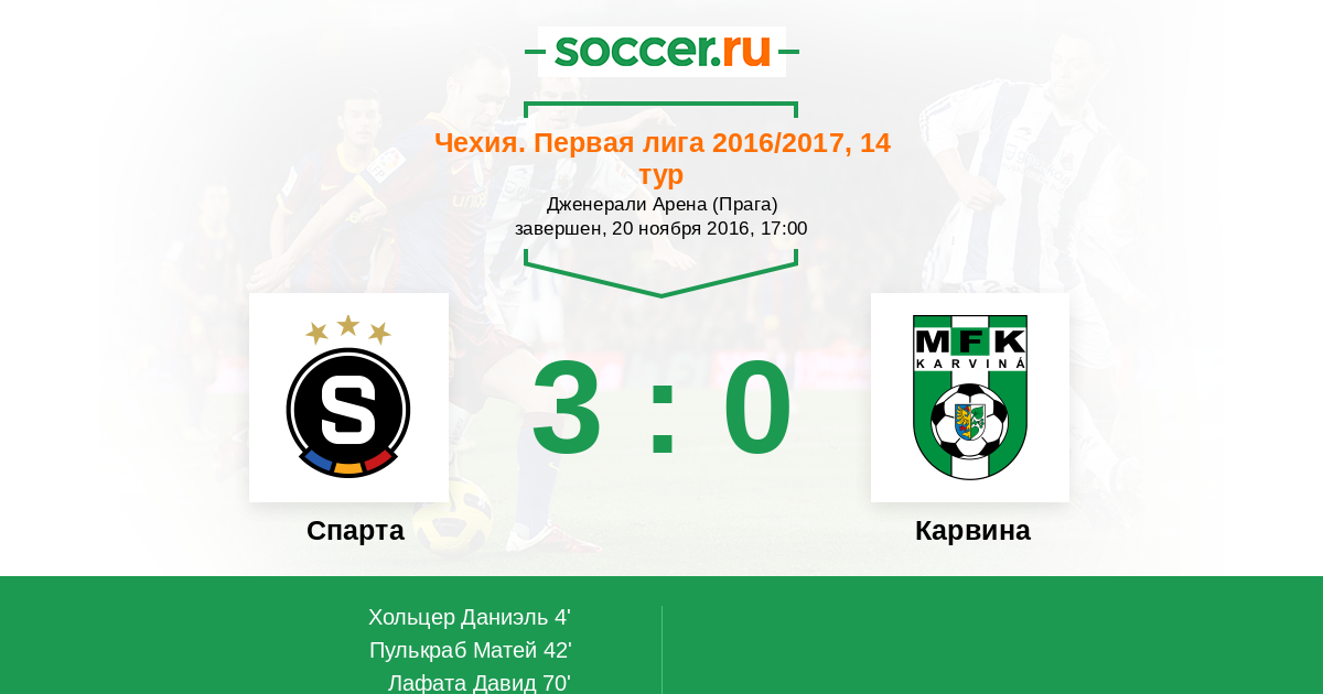 Чехия. Первая Лига 10.09.2017 Спарта Логотип футбольный клуб Спарта (Прага) 2:0 Логотип футбольный клуб Карвина Карвина