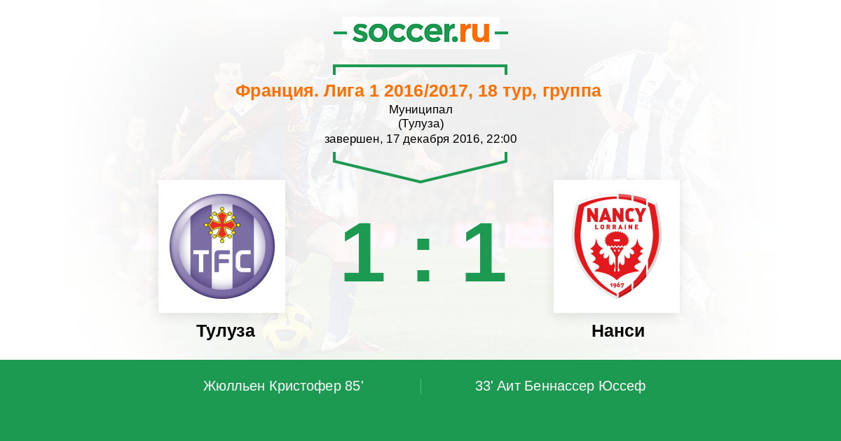 Франция. Лига 1 25.02.2017 Нанси Логотип футбольный клуб Нанси 0:0 Логотип футбольный клуб Тулуза Тулуза