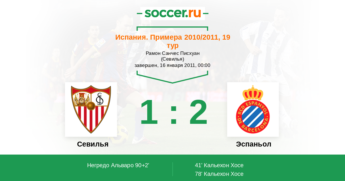 Испания. Примера 14.01.2012 Севилья Логотип футбольный клуб Севилья 0:0 Логотип футбольный клуб Эспаньол (Барселона) Эспаньол