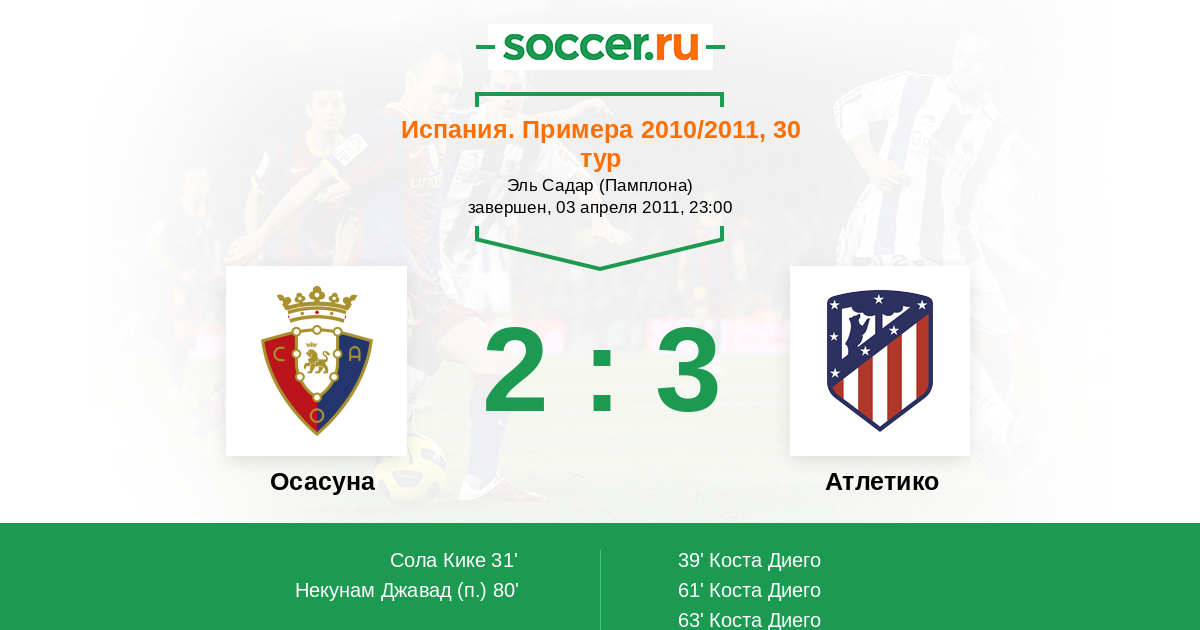 Испания. Примера 13.11.2010 Атлетико Логотип футбольный клуб Атлетико (Мадрид) 3:0 Логотип футбольный клуб Осасуна (Памплона) Осасуна