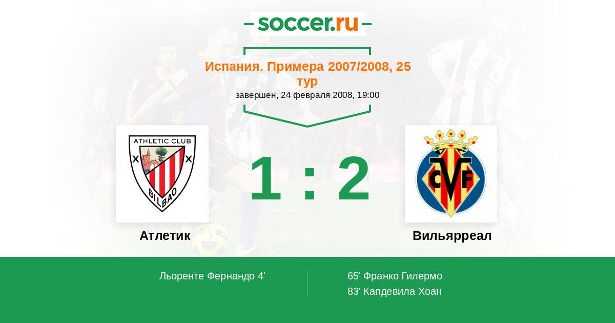 Испания. Примера 14.01.2007 Атлетик Логотип футбольный клуб Атлетик (Бильбао) 0:1 Логотип футбольный клуб Вильярреал Вильярреал