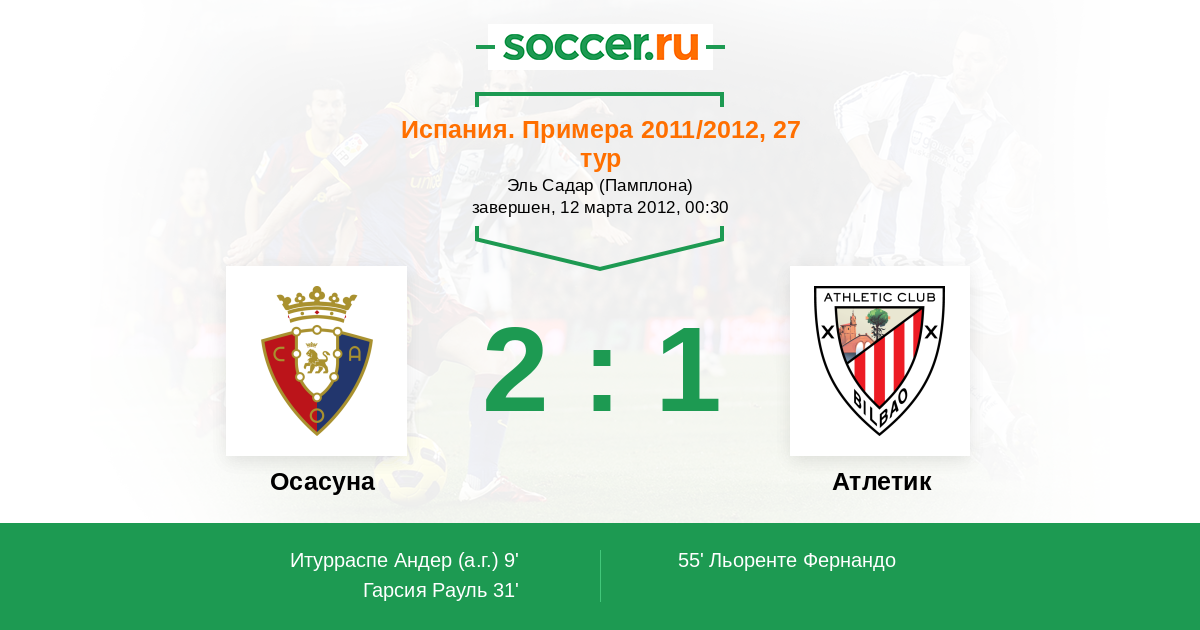 Испания. Примера 07.10.2012 Атлетик Логотип футбольный клуб Атлетик (Бильбао) 1:0 Логотип футбольный клуб Осасуна (Памплона) Осасуна