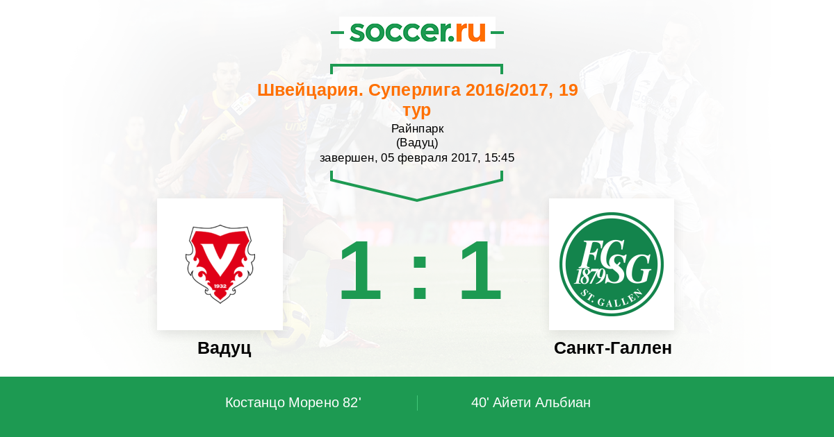Швейцария. Суперлига 22.03.2015 Вадуц Логотип футбольный клуб Вадуц 3:1 Логотип футбольный клуб Санкт-Галлен Санкт-Галлен