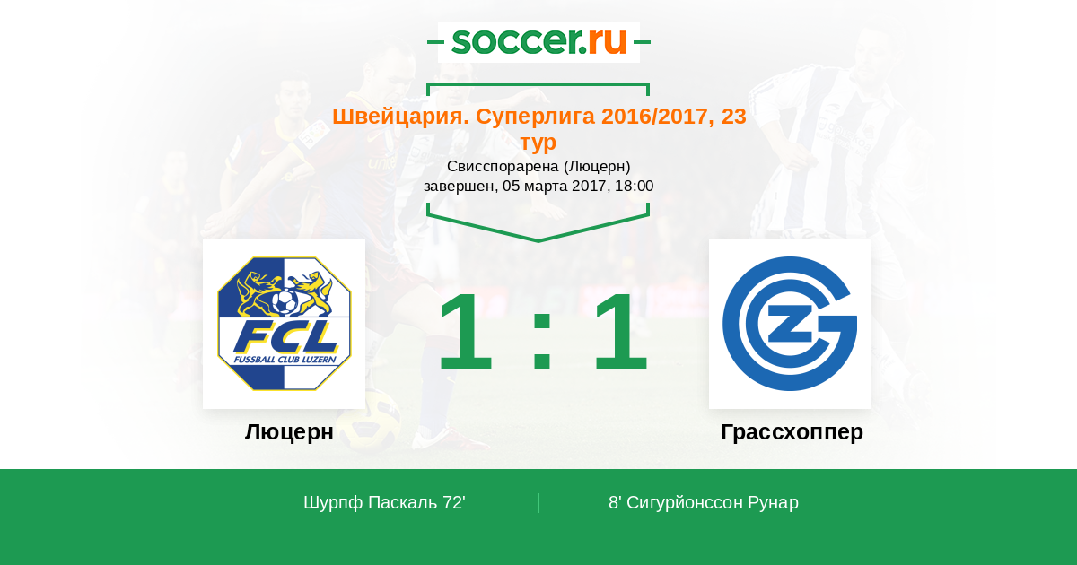 Швейцария. Суперлига 22.04.2017 Грассхоппер Логотип футбольный клуб Грассхоппер (Цюрих) 4:1 Логотип футбольный клуб Люцерн Люцерн