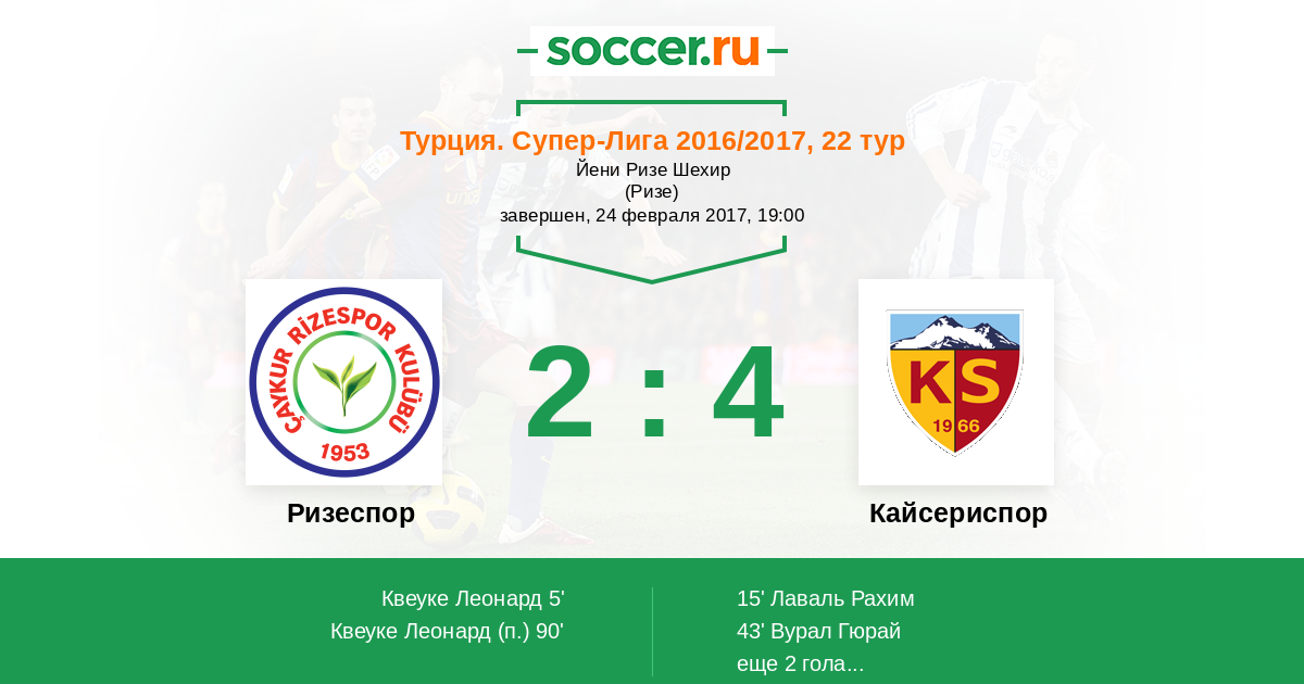 Турция. Суперлига 25.09.2016 Кайсериспор Логотип футбольный клуб Кайсериспор 2:1 Логотип футбольный клуб Ризеспор Ризеспор