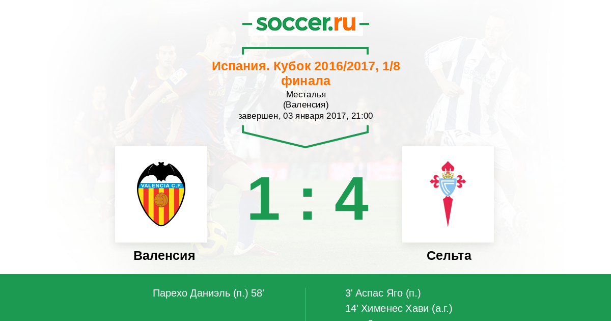Испания. Кубок 12.01.2017 Сельта Логотип футбольный клуб Сельта (Виго) 2:1 Логотип футбольный клуб Валенсия Валенсия