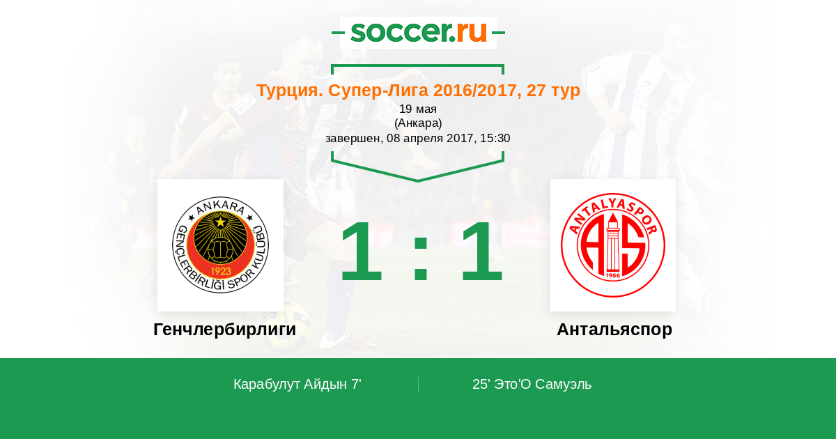 Турция. Суперлига 06.05.2018 Генчлербирлиги Логотип футбольный клуб Генчлербирлиги (Анкара) 0:1 Логотип футбольный клуб Антальяспор Антальяспор