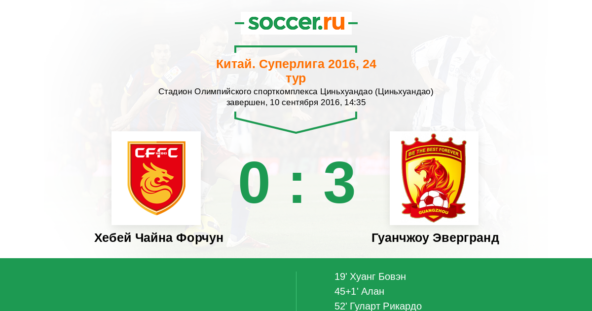 Китай. Суперлига 06.10.2018 Хебей Чайна Форчун Логотип футбольный клуб Хебей Чайна Форчун (Циньхуандао) 0:3 Логотип футбольный клуб Гуанчжоу Эвергранд Гуанчжоу Эвергранд