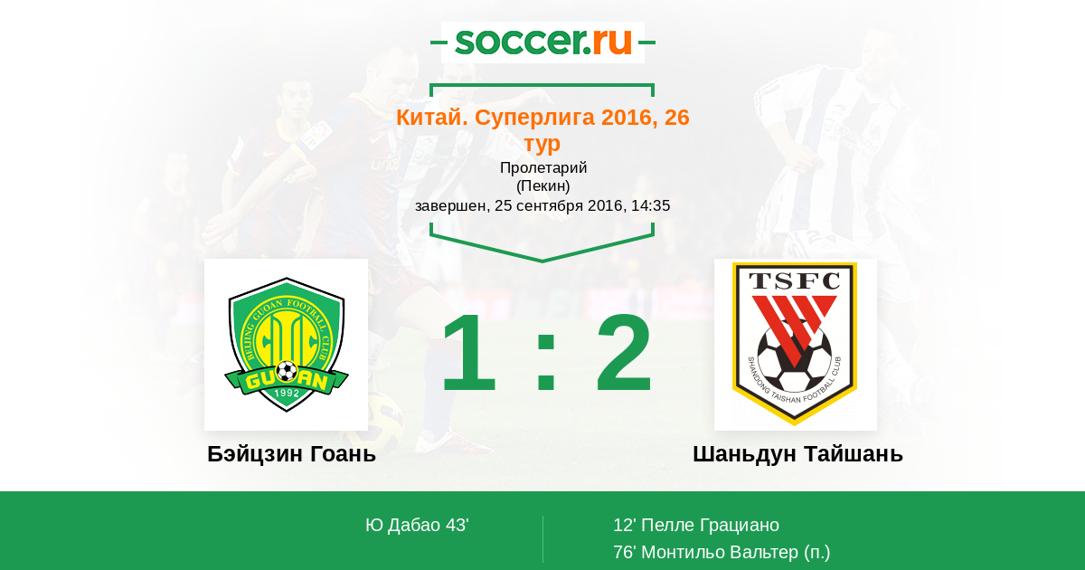 Китай. Суперлига 23.08.2014 Шаньдун Тайшань Логотип футбольный клуб Шаньдун Тайшань (Цзинань) 2:2 Логотип футбольный клуб Бэйцзин Гоань (Пекин) Бэйцзин Гоань