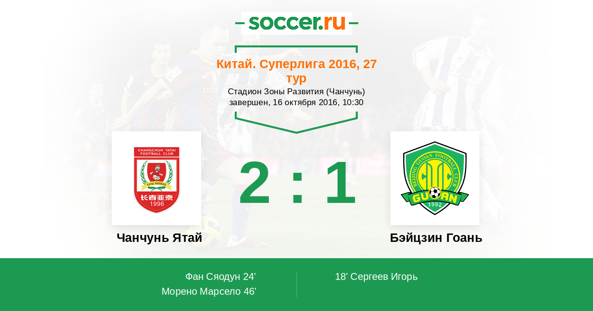 Китай. Суперлига 12.06.2016 Бэйцзин Гоань Логотип футбольный клуб Бэйцзин Гоань (Пекин) 2:0 Логотип футбольный клуб Чанчунь Ятай Чанчунь Ятай