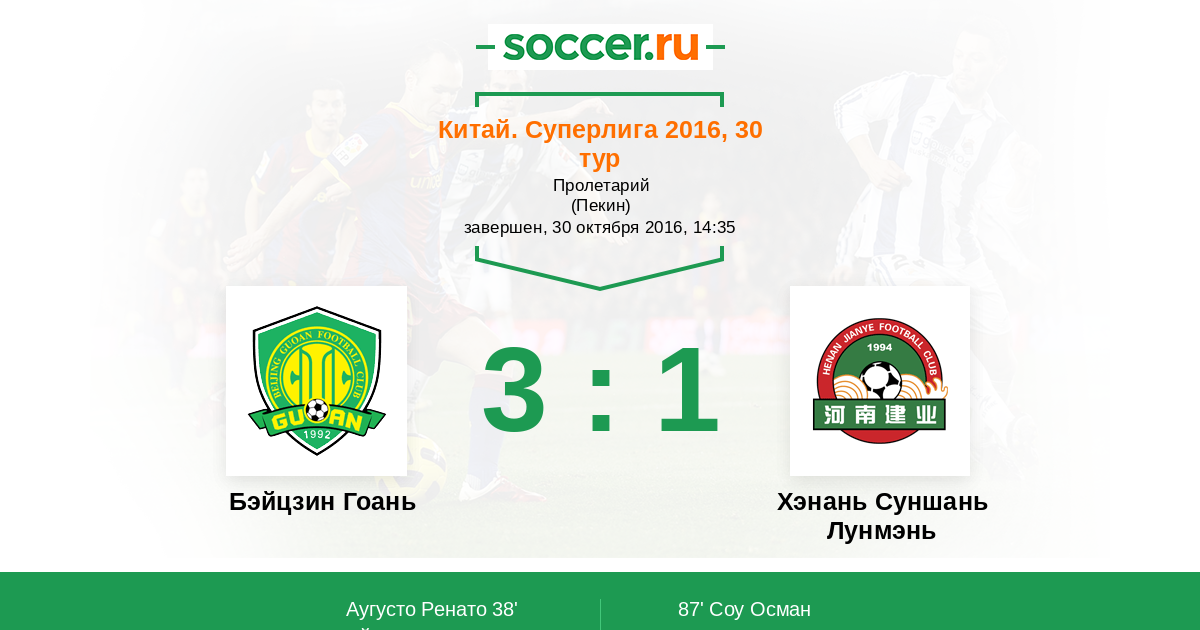 Китай. Суперлига 07.04.2017 Бэйцзин Гоань Логотип футбольный клуб Бэйцзин Гоань (Пекин) 1:0 Логотип футбольный клуб Хэнань Суншань Лунмэнь (Чжэнчжоу) Хэнань Суншань Лунмэнь