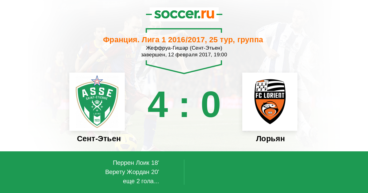 Франция. Лига 1 17.12.2016 Лорьян Логотип футбольный клуб Лорьян 2:1 Логотип футбольный клуб Сент-Этьен Сент-Этьен