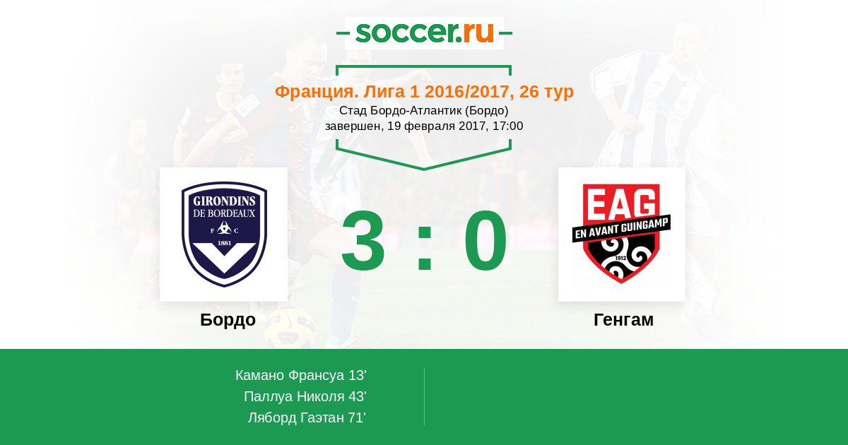 Франция. Лига 1 13.02.2016 Генгам Логотип футбольный клуб Генгам 2:4 Логотип футбольный клуб Бордо Бордо