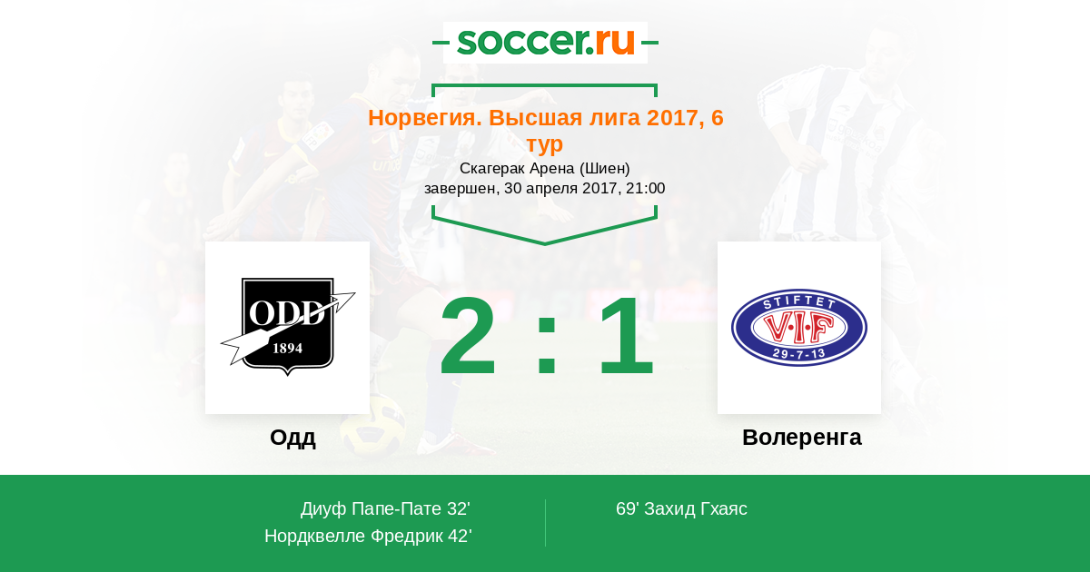 Норвегия. Высшая лига 05.04.2013 Одд Логотип футбольный клуб Одд (Шиен) 2:0 Логотип футбольный клуб Волеренга (Осло) Волеренга