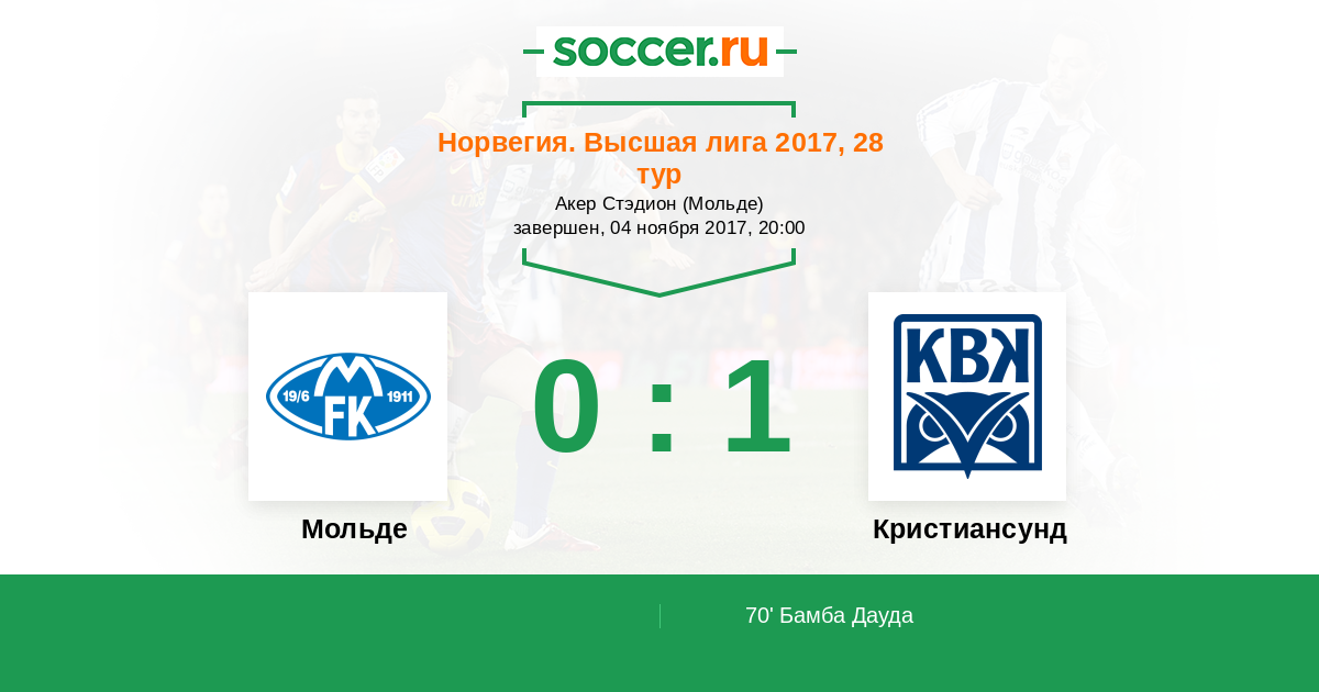 Норвегия. Высшая лига 01.04.2017 Кристиансунд Логотип футбольный клуб Кристиансунд 0:1 Логотип футбольный клуб Мольде Мольде