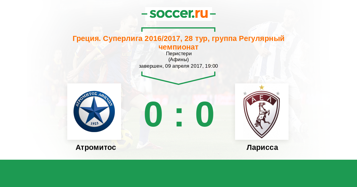 Греция. Суперлига 17.09.2017 Ларисса Логотип футбольный клуб Ларисса 0:0 Логотип футбольный клуб Атромитос (Перистери) Атромитос