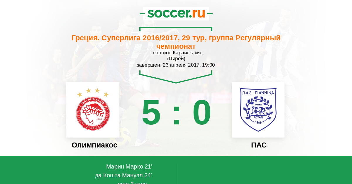 Греция. Суперлига 12.12.2016 ПАС Логотип футбольный клуб ПАС (Яннина) 0:2 Логотип футбольный клуб Олимпиакос (Пирей) Олимпиакос