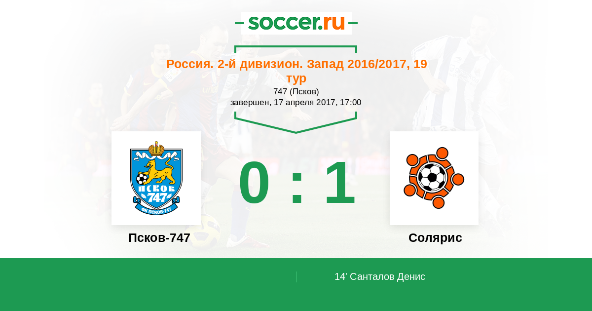 Россия. Вторая лига. Группа 2 17.04.2017 Псков-747 Логотип футбольный клуб Псков-747 0:1 Логотип Солярис (Москва) Солярис