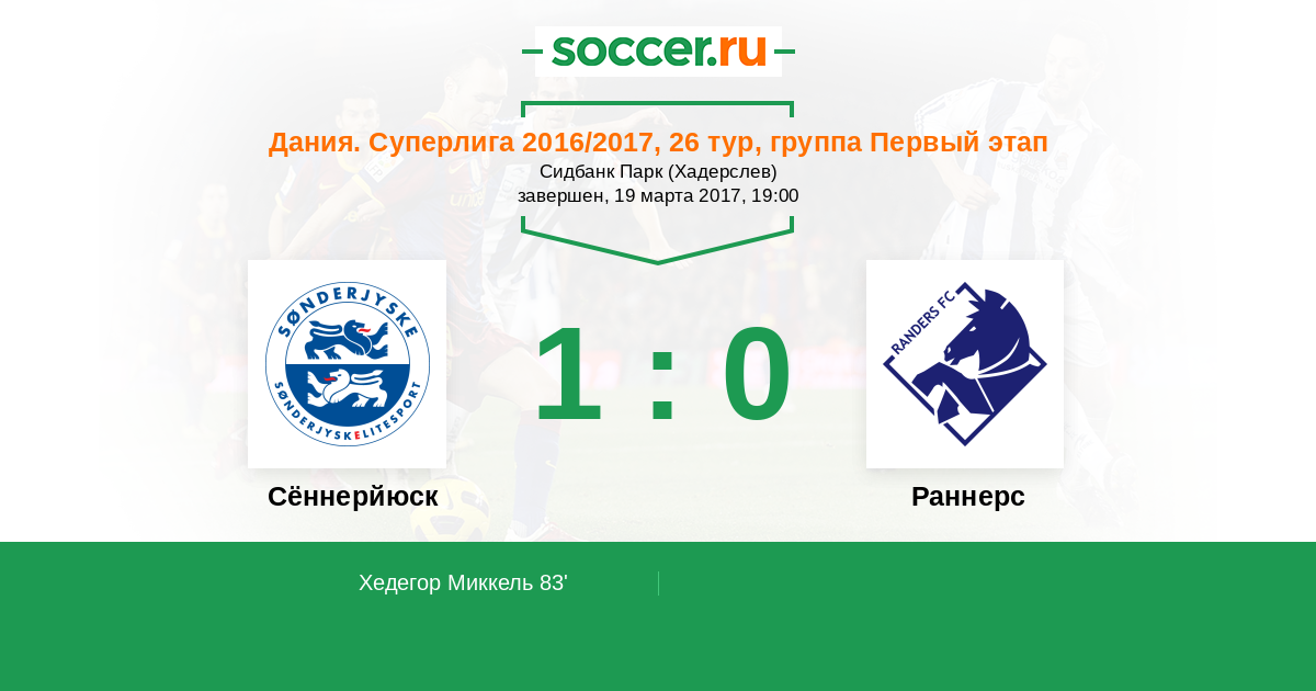 Дания. Суперлига 25.09.2016 Раннерс Логотип футбольный клуб Раннерс 0:4 Логотип футбольный клуб Сённерйюск (Хадерслев) Сённерйюск