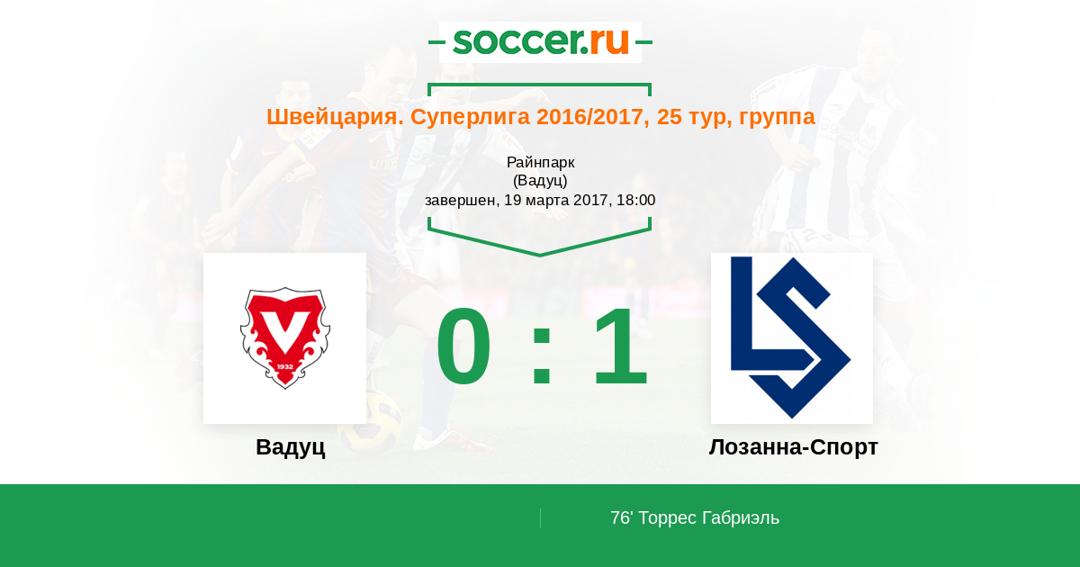 Швейцария. Суперлига 29.04.2017 Лозанна-Спорт Логотип футбольный клуб Лозанна-Спорт 1:3 Логотип футбольный клуб Вадуц Вадуц