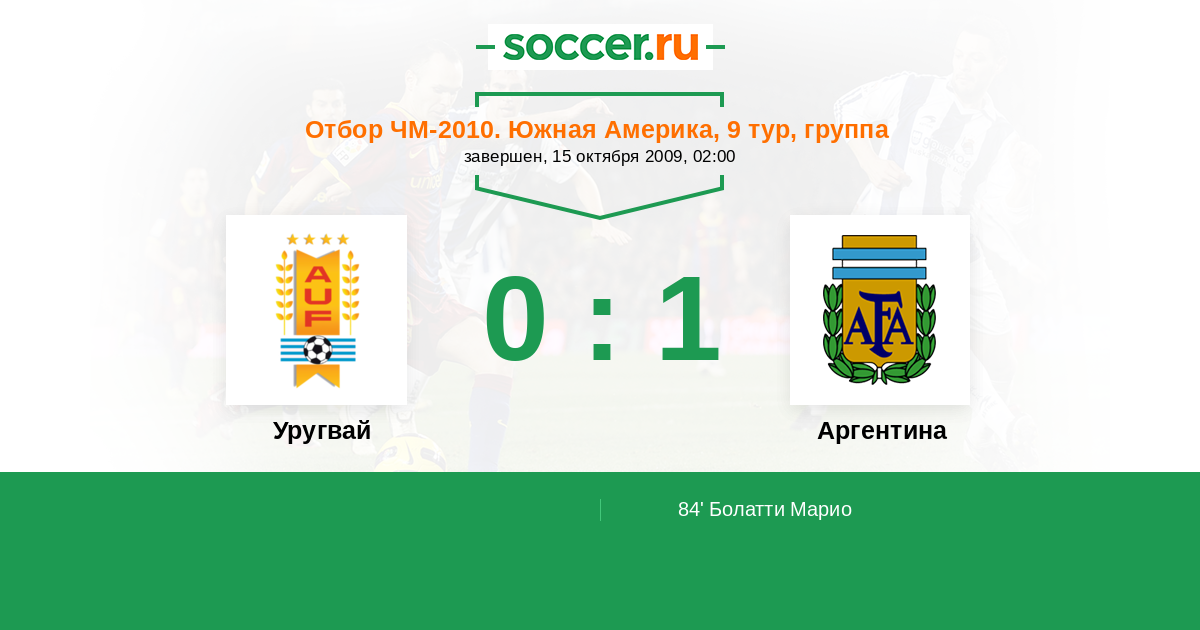 Отбор ЧМ. Южная Америка 12.10.2008 Аргентина Логотип Аргентина 2:1 Логотип Уругвай Уругвай