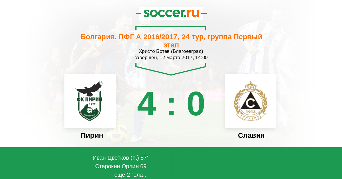 Болгария. Первая лига 23.10.2016 Славия Логотип футбольный клуб Славия (София) 3:1 Логотип футбольный клуб Пирин (Благоевград) Пирин