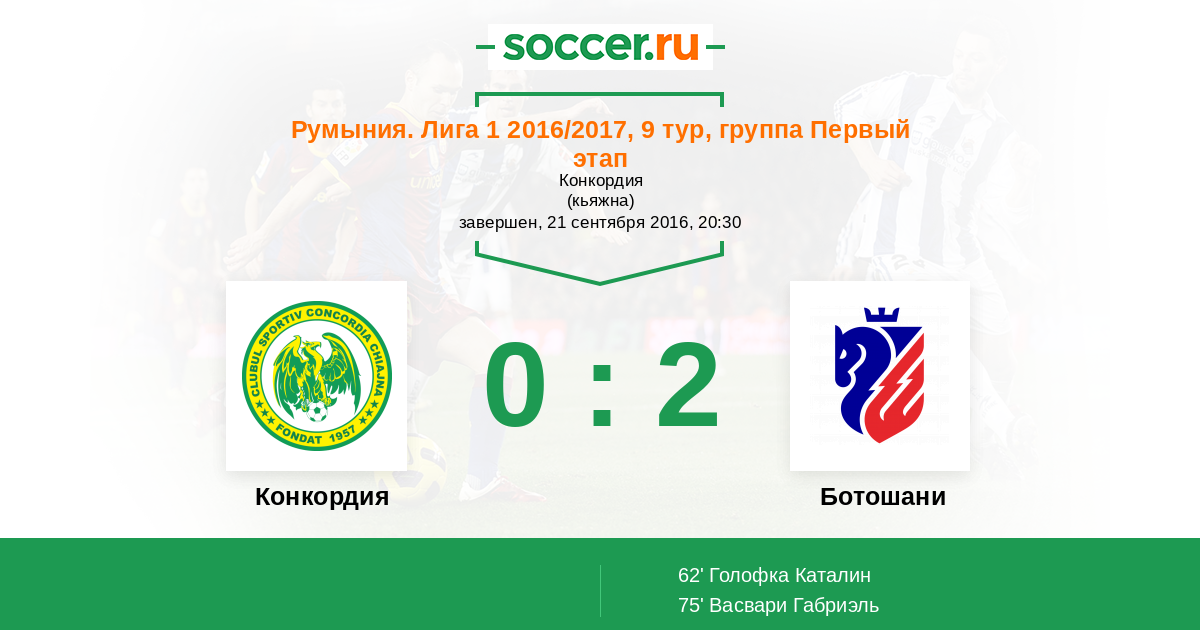 Румыния. Лига 1 22.09.2018 Ботошани Логотип футбольный клуб Ботошани 0:2 Логотип футбольный клуб Конкордия (Кяжна) Конкордия