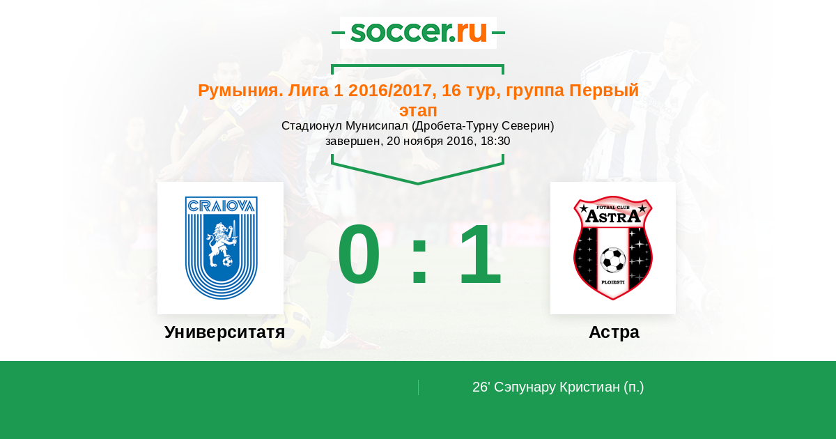 Румыния. Лига 1 30.10.2015 Астра Логотип футбольный клуб Астра (Джурджу) 1:0 Логотип футбольный клуб Университатя Крайова Университатя Крайова