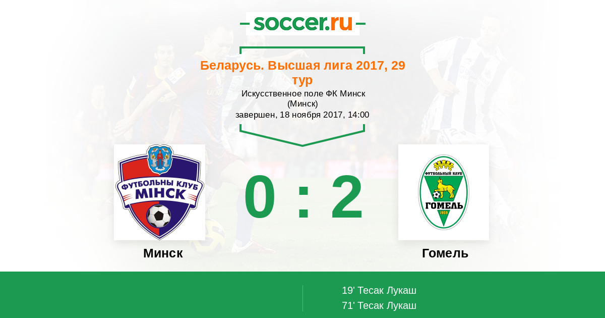 Беларусь. Высшая лига 10.11.2018 Гомель Логотип футбольный клуб Гомель 0:2 Логотип футбольный клуб Минск Минск