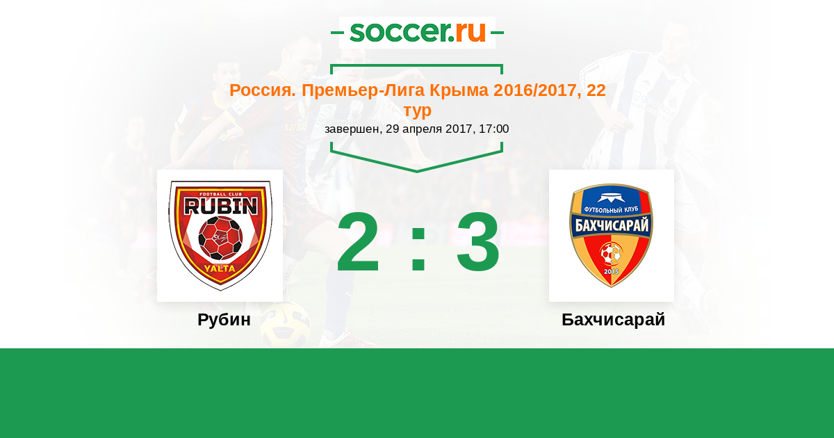 Россия. Премьер-Лига Крыма 29.04.2017 Рубин Логотип футбольный клуб Рубин (Ялта) 2:3 Логотип футбольный клуб Бахчисарай Бахчисарай