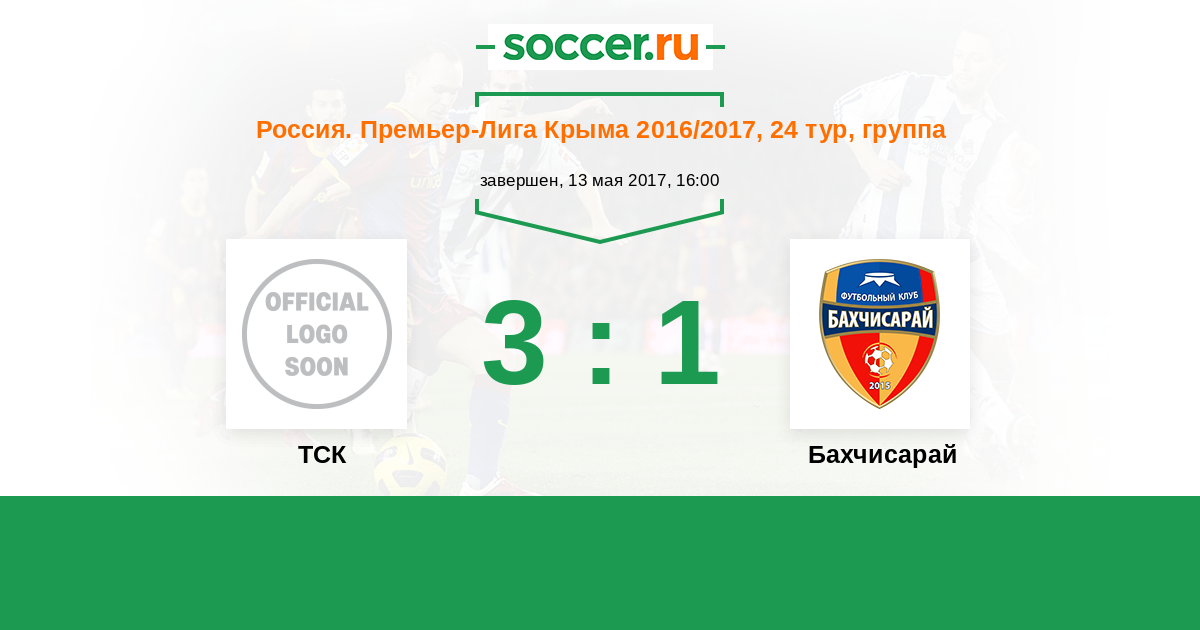 Россия. Премьер-Лига Крыма 13.05.2017 ТСК Логотип футбольный клуб ТСК (Симферополь) 3:1 Логотип футбольный клуб Бахчисарай Бахчисарай