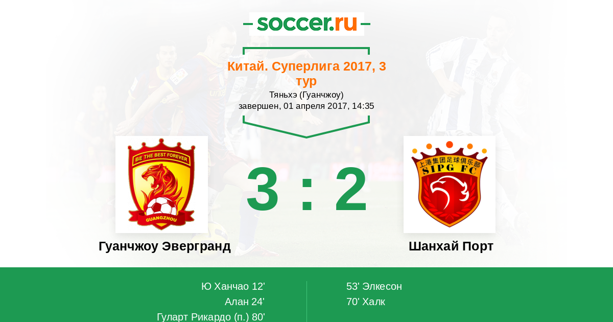 Китай. Суперлига 30.04.2014 Гуанчжоу Эвергранд Логотип футбольный клуб Гуанчжоу Эвергранд 5:0 Логотип футбольный клуб Шанхай Порт Шанхай Порт