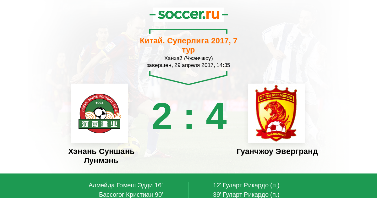 Китай. Суперлига 15.07.2015 Гуанчжоу Эвергранд Логотип футбольный клуб Гуанчжоу Эвергранд 1:1 Логотип футбольный клуб Хэнань Суншань Лунмэнь (Чжэнчжоу) Хэнань Суншань Лунмэнь