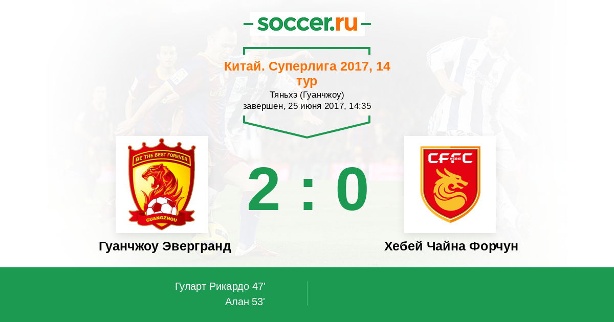 Китай. Суперлига 10.09.2016 Хебей Чайна Форчун Логотип футбольный клуб Хебей Чайна Форчун (Циньхуандао) 0:3 Логотип футбольный клуб Гуанчжоу Эвергранд Гуанчжоу Эвергранд