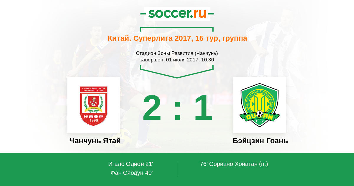 Китай. Суперлига 12.06.2016 Бэйцзин Гоань Логотип футбольный клуб Бэйцзин Гоань (Пекин) 2:0 Логотип футбольный клуб Чанчунь Ятай Чанчунь Ятай