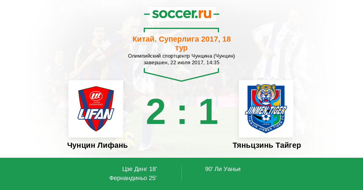 Китай. Суперлига 21.07.2018 Тяньцзинь Тайгер Логотип футбольный клуб Тяньцзинь Тайгер 1:2 Логотип футбольный клуб Чунцин Лифань Чунцин Лифань