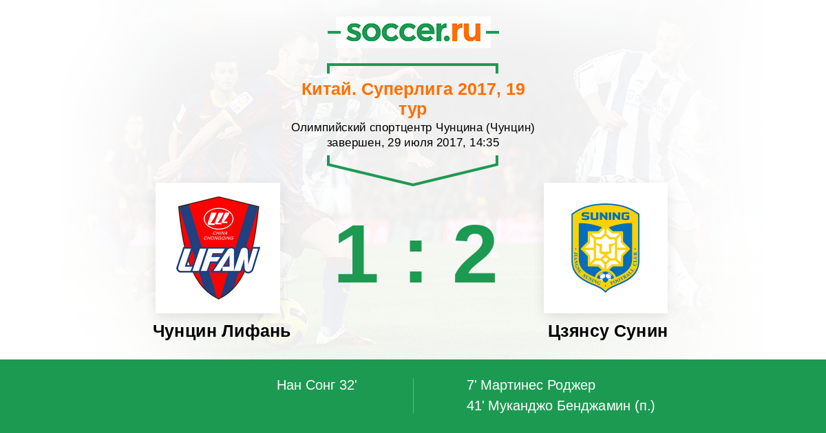 Китай. Суперлига 07.04.2017 Цзянсу Сунин Логотип футбольный клуб Цзянсу Сунин 1:2 Логотип футбольный клуб Чунцин Лифань Чунцин Лифань