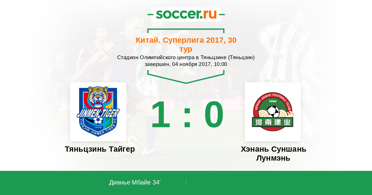 Китай. Суперлига 01.07.2017 Хэнань Суншань Лунмэнь Логотип футбольный клуб Хэнань Суншань Лунмэнь (Чжэнчжоу) 0:0 Логотип футбольный клуб Тяньцзинь Тайгер Тяньцзинь Тайгер