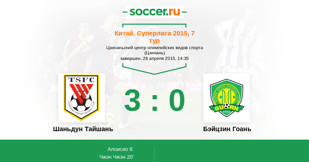 Китай. Суперлига 19.04.2014 Бэйцзин Гоань Логотип футбольный клуб Бэйцзин Гоань (Пекин) 0:3 Логотип футбольный клуб Шаньдун Тайшань (Цзинань) Шаньдун Тайшань
